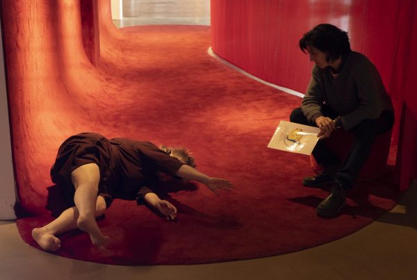 Bernt:  Yeah, it’s been a very long process… [inaudible]. This year. And then we didn’t meet again until the day before the premiere. So it was a bit, like, hard to get into, in the sense that you feel like you have to sort of start over again every time because so much time has passed. And I don’t think I have the same way of, like, embodying the concept or the embryology. I mean I don’t have that natural connection that the dancers had so I guess my approach was to have a more, work with sort of like, connect, try to connect the sound to, like, bodily function or how we perceive sound and what kind of effect it has. And and it’s also like always a balance between like using very kind of like obvious sounds like heartbeats or womb sounds or whatever and and it’s very kind of like all movements are very kind of slow and fluid and all of that and so it’s very easy to be dragged towards that. Just like underlie that that droney, flowy, fluid whatever thing. So the biggest challenge I guess is to sort of try to contrast that or break it up or like to add something to break it up a bit and not just go along with this the natural flow of things. But yeah, I mean, the, it’s sort of like two part also, there’s the things that are happening in here which it’s very much improvised, and it’s quite different every every day, which I enjoy, some days it works great, others it’s more like, today was more searching but I kind of enjoyed that as well, it it never manages to manifest, and I guess you can see that as a way of like how we try to build and create something together, it’s nice. And then for the parts that are out there in the space, it’s more sort of taking concepts from psychoacoustics in terms of how we perceive sound, which is not necessarily measurable but how different kind of sounds yeah create different psychoacoustic effects. So sort of to keep it connected to the the body and the humanness and trying to not be too like obvious. I mean, there have to be some heartbeats and womb sounds of course, but but just not all the time. Yeah.