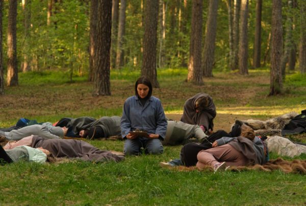 The final activity was a collective visualization of the end. The audience could choose one of two scenarios: death by drowning or dehydration. That day, the group chose the latter. Lying or sitting on blankets spread on the ground with our eyes closed, we listened to a detailed description of death, the biological mechanisms occurring in our bodies as a result of water deprivation. The medical, cold, and devoid of empathy nature of the text, describing what was theoretically happening to my body, caused me resistance. I didn’t want to hear it, let alone imagine myself in such a situation. Nature unexpectedly proved to be my refuge – the rustle of trees and grass in the rising wind, which drowned out the narrator’s words, and I could feel it on my skin. In this visualization, the actual reference to the surrounding nature became crucial as a warning, proving to be a safety valve.